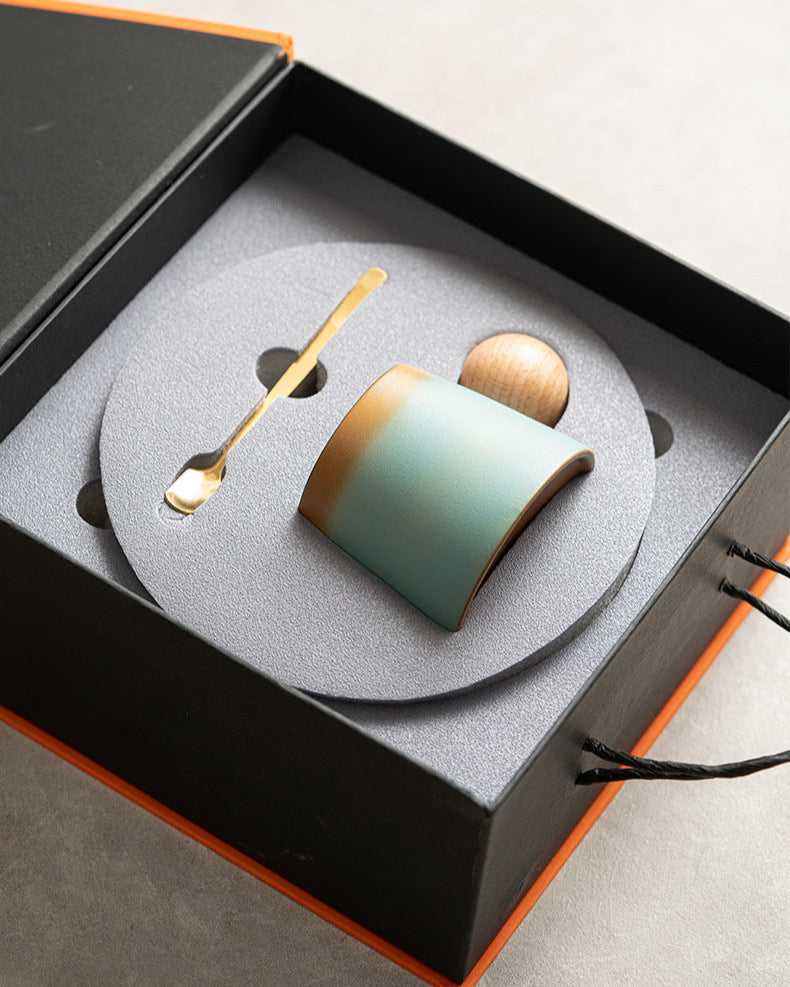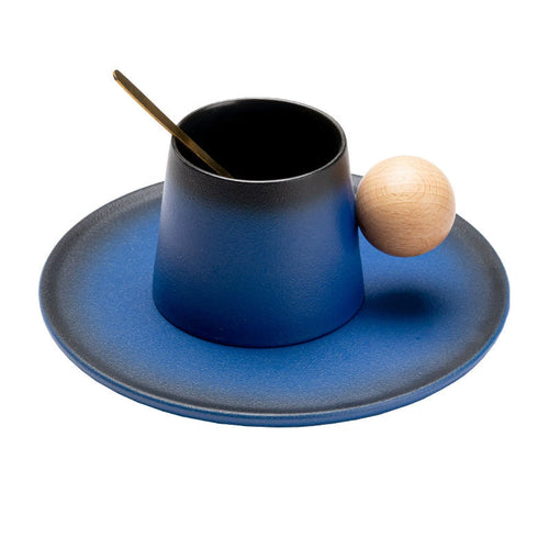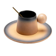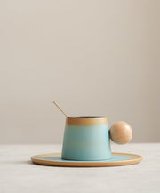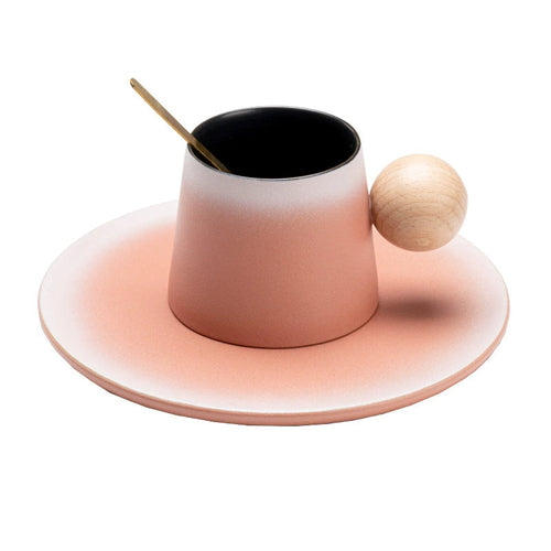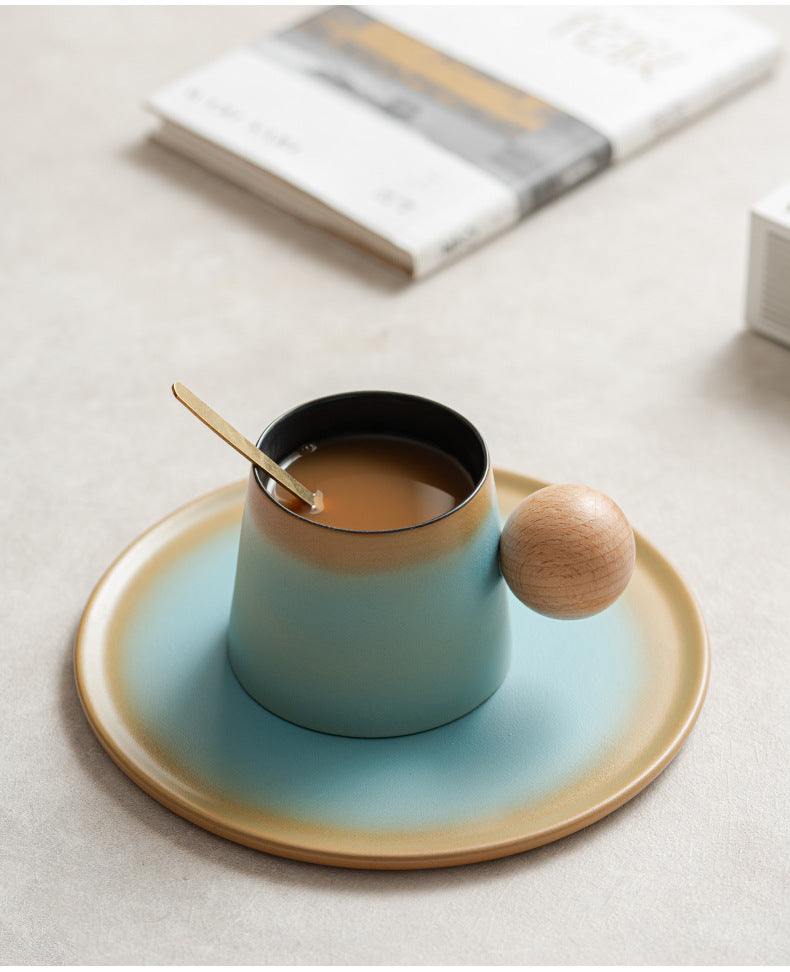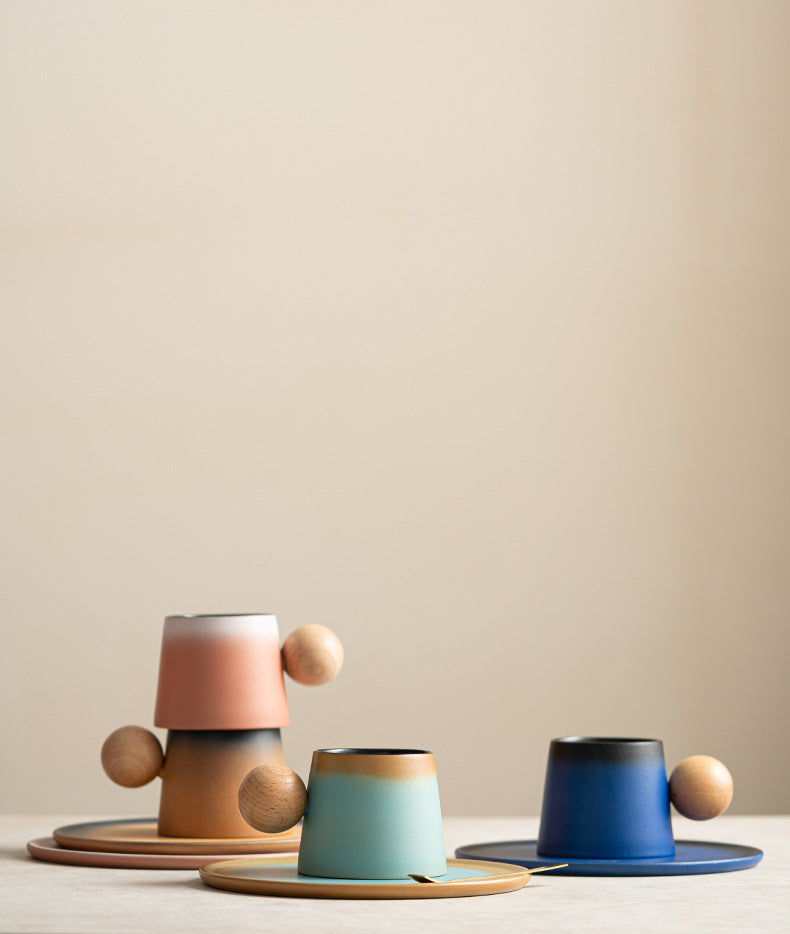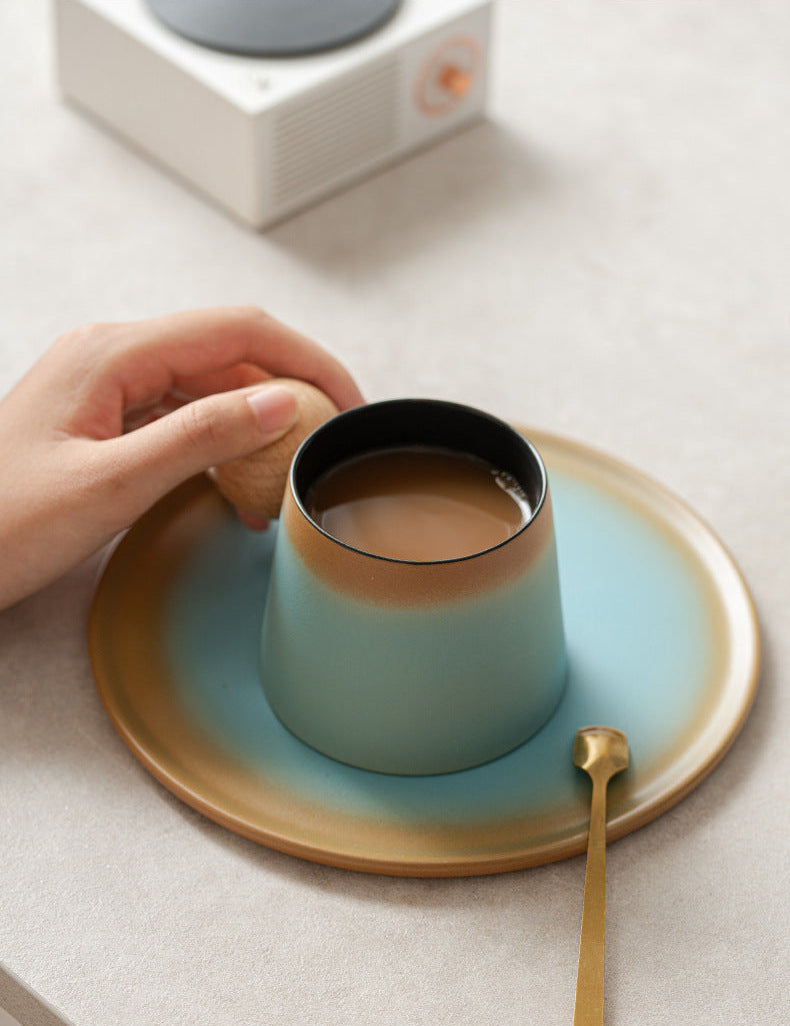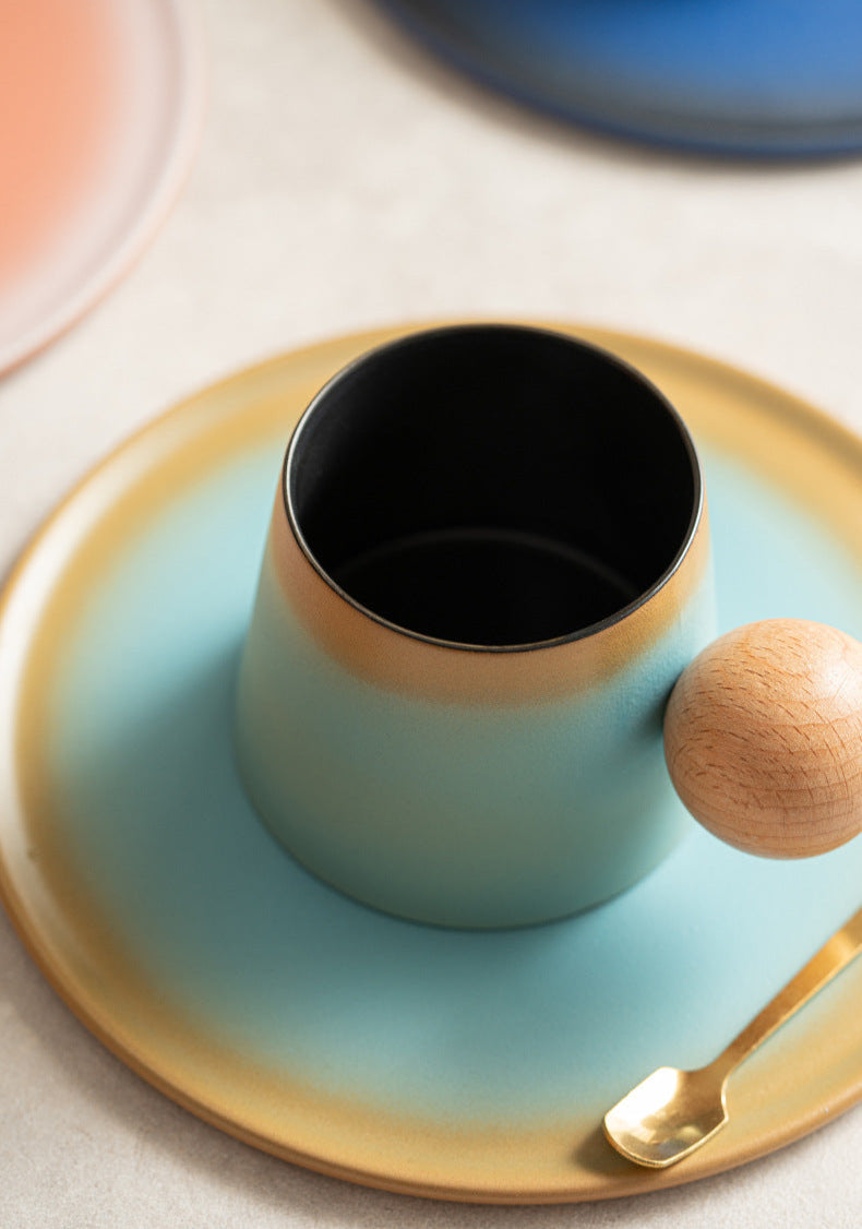 Natural Wood Handle Ceramic Coffee Cup & Saucer Set – Ombre Glaze